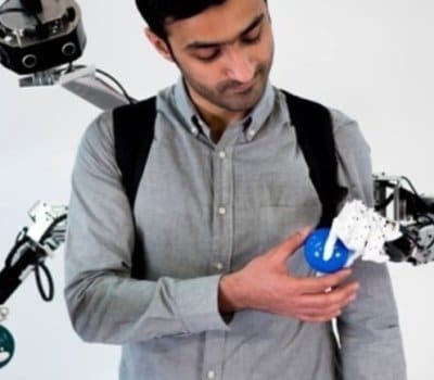 - La otra persona usa una mochila que contiene los dos brazos robóticos, una cámara y baterías. La cámara alimenta imágenes visuales al dispositivo de realidad virtual.